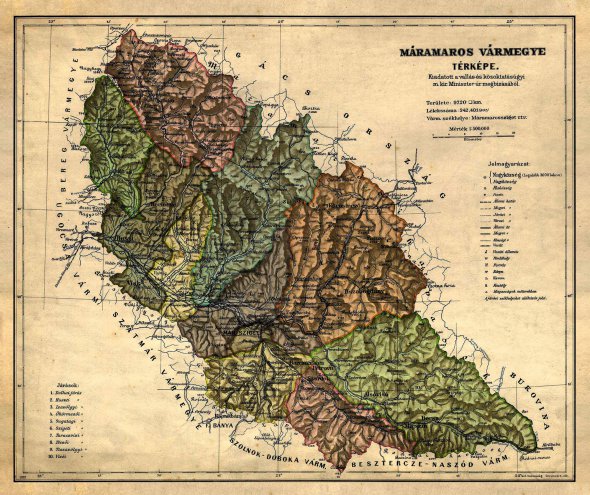 Карта Мармароського комітату в складі Угорщини, початок ХХ століття. Займав східну частину сучасної Закарпатської області й теперішній жудець Мармарош у Румунії. Майже половину населення становили українці – офіційна назва ”русини”. Також проживало багато угорців, румунів, німців і євреїв. У січні 1919 року Гуцульська Республіка контролювала територію між Ясінею – угорська назва Kо”rо¨ smezо” – і Мармароським Сиготом – Ma’ ramaros Sziget