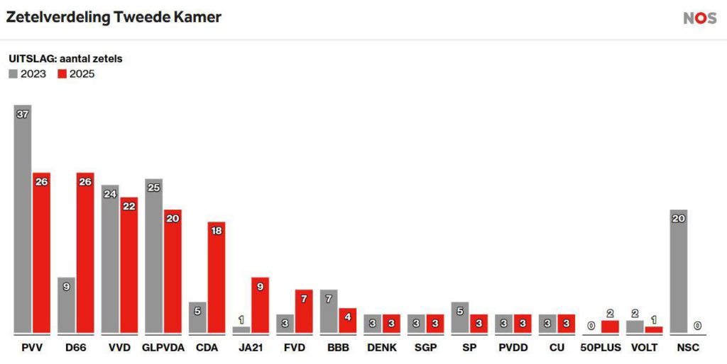 Політичний ландшафт Нідерландів кардинально змінився за результатами дострокових парламентських виборів 29 жовтня. Соціал-ліберальна партія “Демократи 66” (D66) здобула приголомшливу перемогу, тоді як партії, що перемогли у 2023 році, зокрема “Новий суспільний договір” (NSC), повністю зникли з політичної арени.
