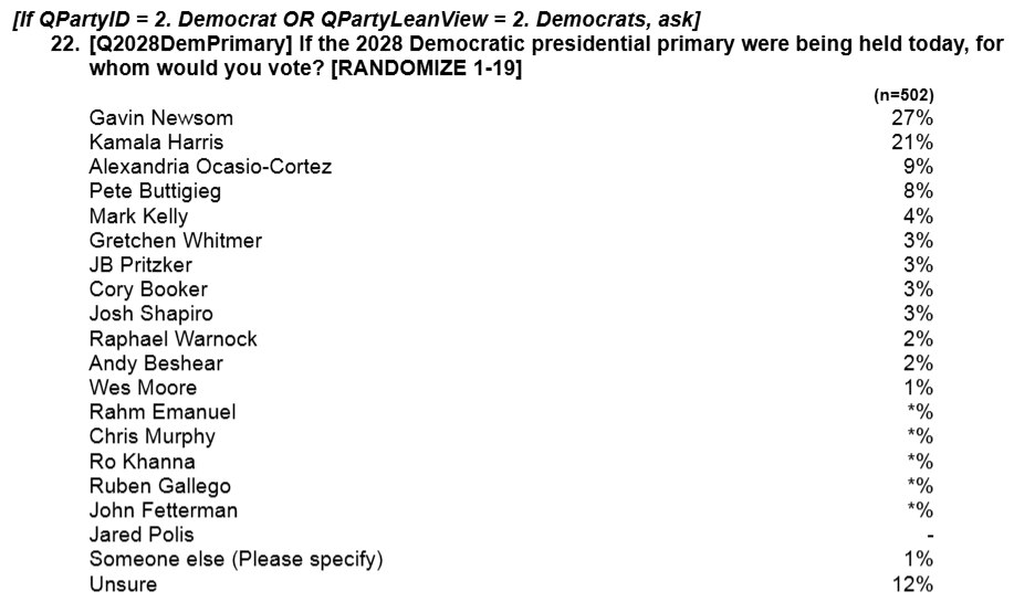 У таборі демократів ситуація виглядає найбільш динамічно. Підтримка ключових фігур — віцепрезидентки Камали Гарріс та губернатора Каліфорнії Гевіна Ньюсома — демонструє дивовижну амплітуду. Залежно від вибірки та настроїв респондентів, лідерство переходить від одного до іншого, подекуди з колосальним відривом.