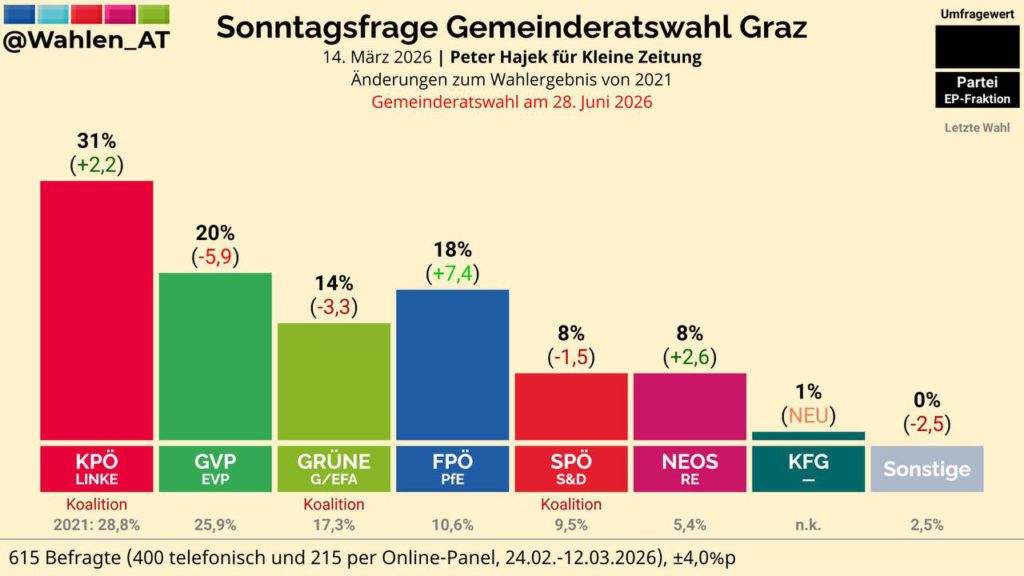 Згідно з останніми опитуваннями громадської думки (березень 2026 року), підтримка KPÖ сягає 31% і продовжує зростати. Це робить Грац, ймовірно, найбільшим західноєвропейським містом, де партія, яка відкрито називає себе комуністичною, утримує перше місце.
