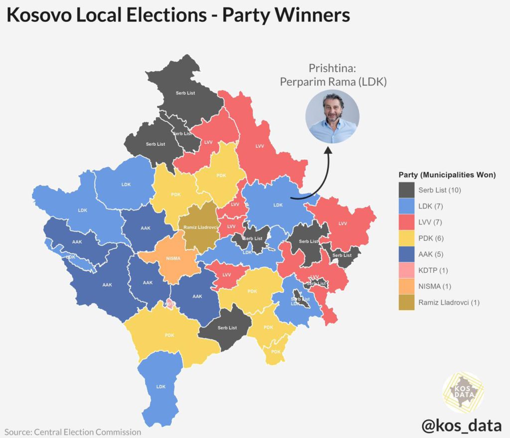 За підсумками виборчої кампанії політична карта Косова виявилася дуже строкатою. Найбільшу кількість муніципалітетів здобув «Сербський список» — ця партія взяла владу в усіх 10 муніципалітетах, де переважає сербське населення. Варто зазначити, що серби становлять лише близько 5% від загального населення Косова.