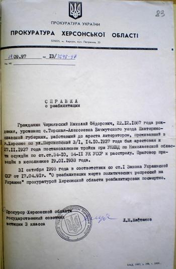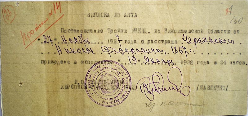 Постановление Тройки УНКВД по Николаевской области от 27 ноября 1937 года о расстреле Чернявского Николая Федоровича, 1867 г. приведено в исполнение 19 января 1938 года в 24 часа. И.о. начальника Херсонского горотдела НКВД Павленко.