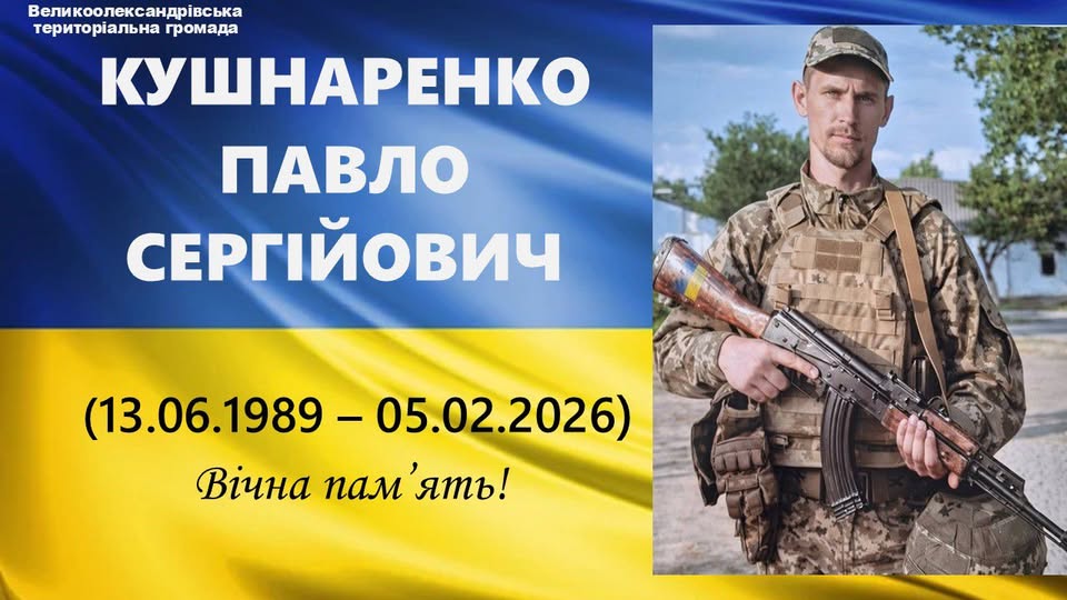 ХЕРСОНСЬКА ОБЛАСТЬ—Великоолександрівська селищна територіальна громада 1 березня 2026 року проводить в останню путь свого вірного сина – мужнього Захисника України Павла Сергійовича Кушнаренка.
