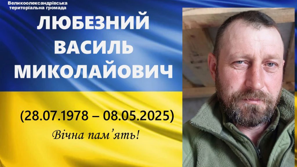 ХЕРСОНСЬКА ОБЛАСТЬ—Великоолександрівська громада знову отримала трагічну звістку, яка чорним крилом огорнула серце кожного земляка. У боротьбі за територіальну цілісність та незалежність України загинув житель села Людмилівка — Любезний Василь Миколайович.