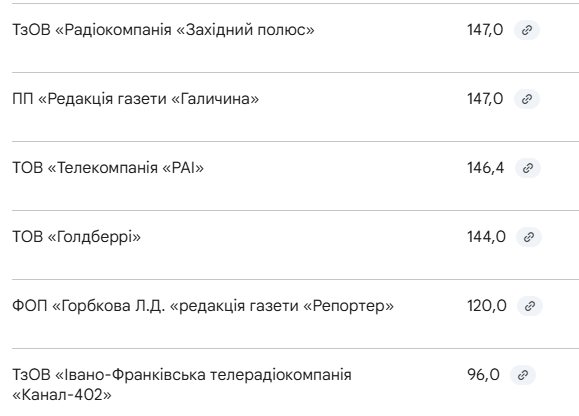 ТзОВ «Телерадіокомпанія «РАІ» — 295,44 тис. грн; Івано-Франківське обласне телебачення «Галичина» — 268,5 тис. грн; ТОВ «АМП Груп» — 171,396 тис. грн; ТОВ «ТРК 3-Студія» — 149,4 тис. грн; ПП «Редакція газети «Галичина» та ТзОВ «Радіокомпанія «Західний полюс» — по 147,0 тис. грн.