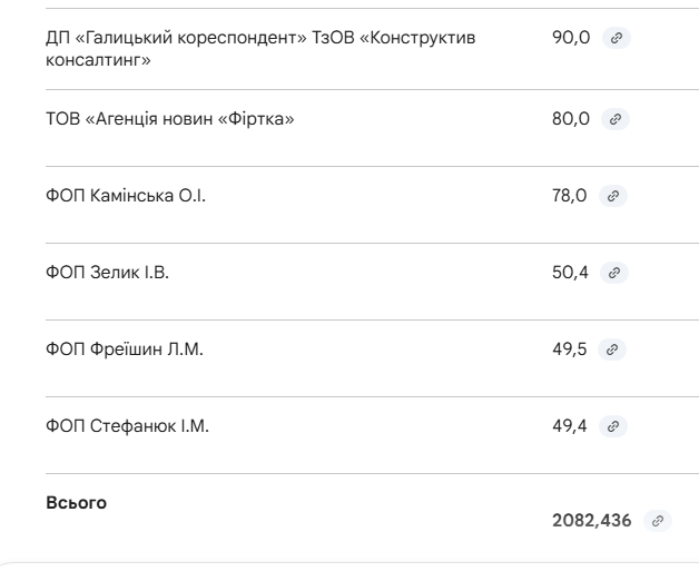 До списку також увійшли такі видання та онлайн-ресурси як «Репортер» (120 тис. грн), «Галицький кореспондент» (90 тис. грн), агенція новин «Фіртка» (80 тис. грн) та «Канал-402» (96 тис. грн).